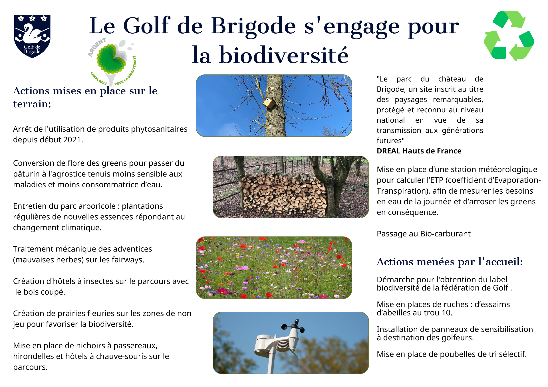 Le golf de Brigode a fait part en 2022 de sa volonté d'obtenir le label biodiversité au niveau argent. Depuis, nous multiplions les actions afin de l'obtenir et adoptons les pratiques d'un golf responsable. En collaboration avec l'équipe terrain, dirigée par Hervé, ainsi que la direction du golf.